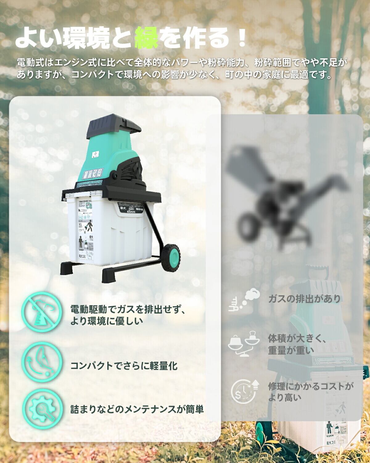 この電動粉砕機は、庭作業をより快適にし、環境に優しい活動を実現するための必需品です。あなたの生活や趣味を豊かにするための大切なアイテムとして、ぜひ手に入れてください!