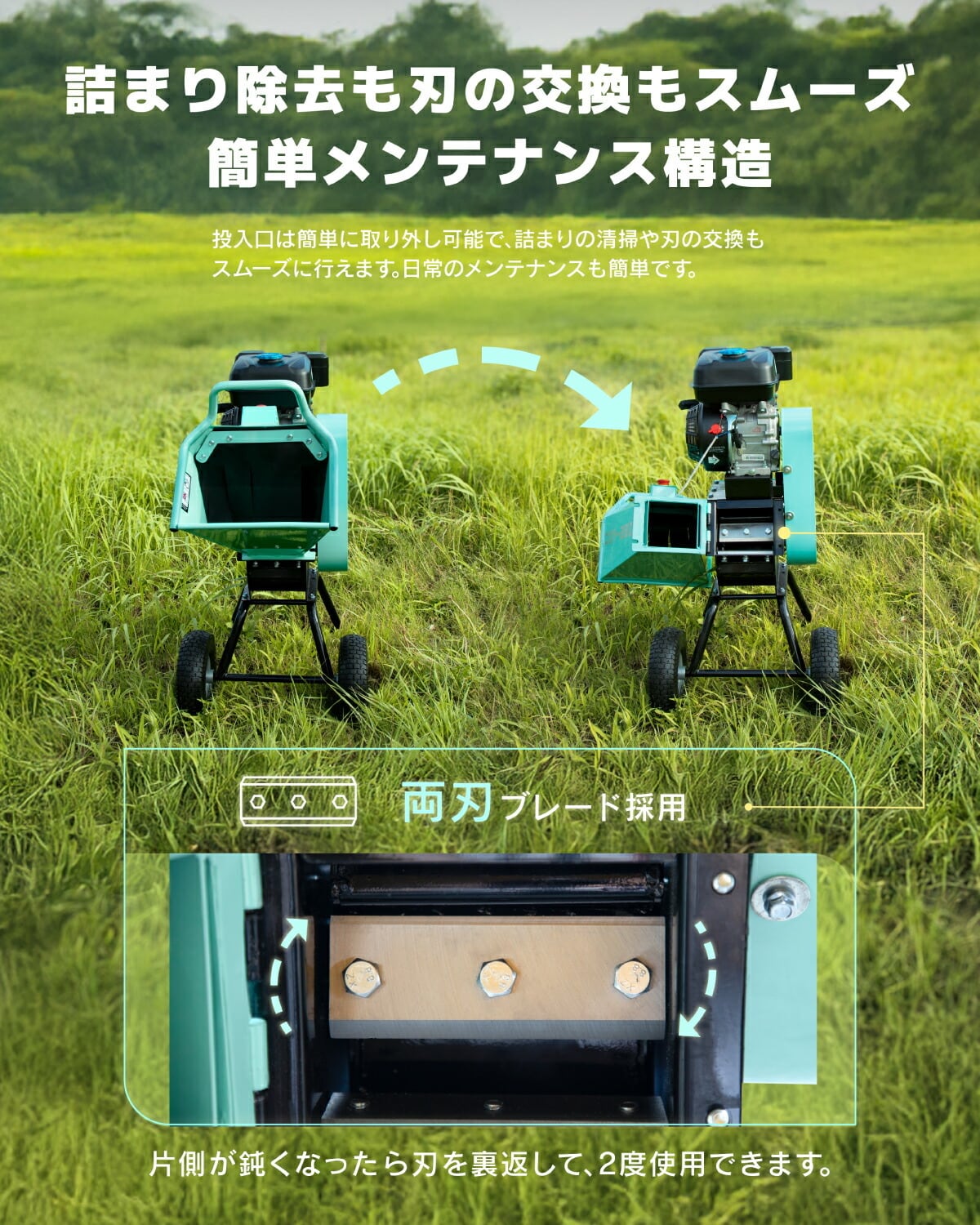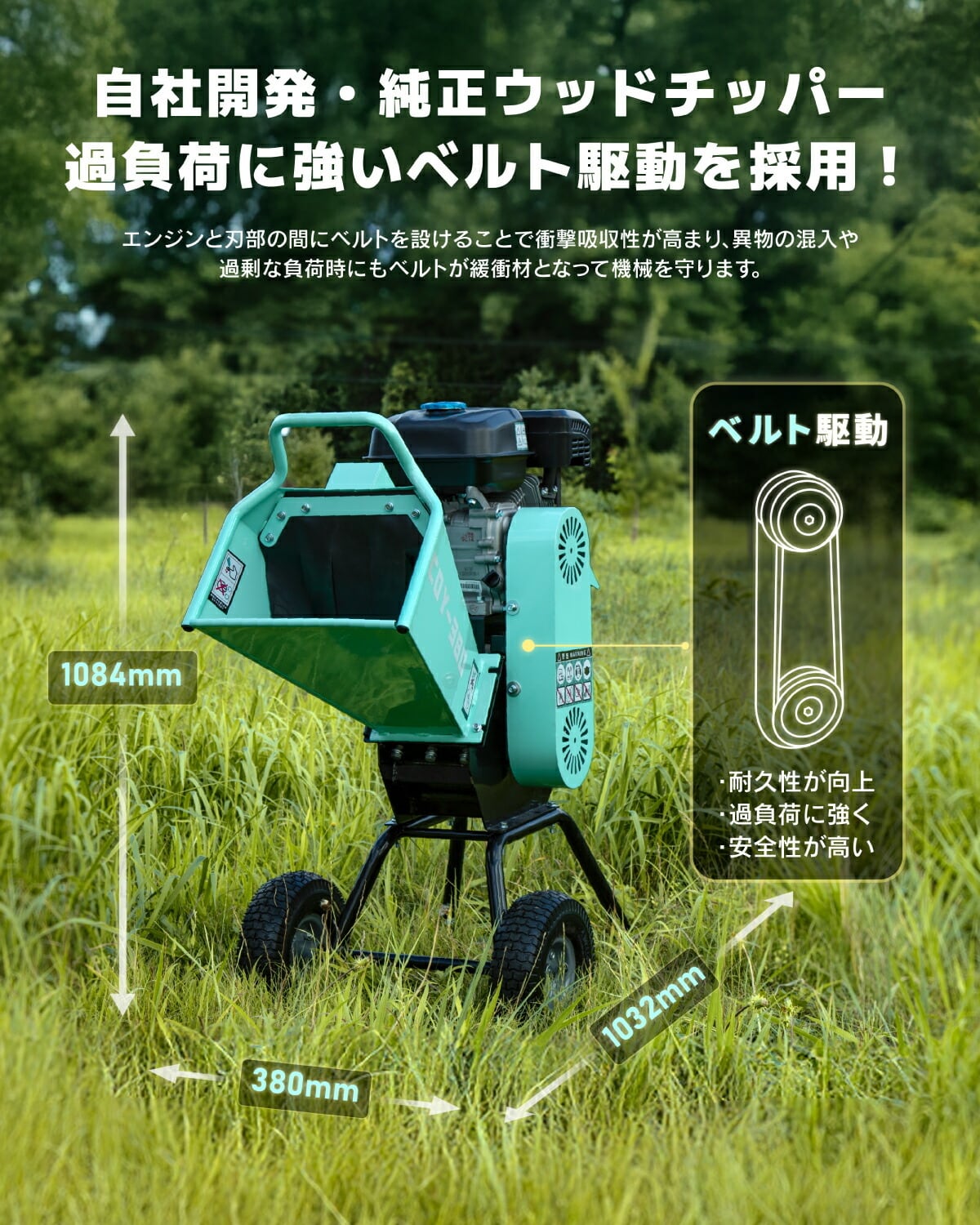【高効率の4サイクルOHVエンジン】このウッドチッパーには、4サイクルOHVエンジンが搭載されており、安定した動作と高効率を誇ります。長時間の作業でも信頼性が高く、安定したパフォーマンスを維持しますので、プロフェッショナルからアマチュアまで幅広く対応できます。