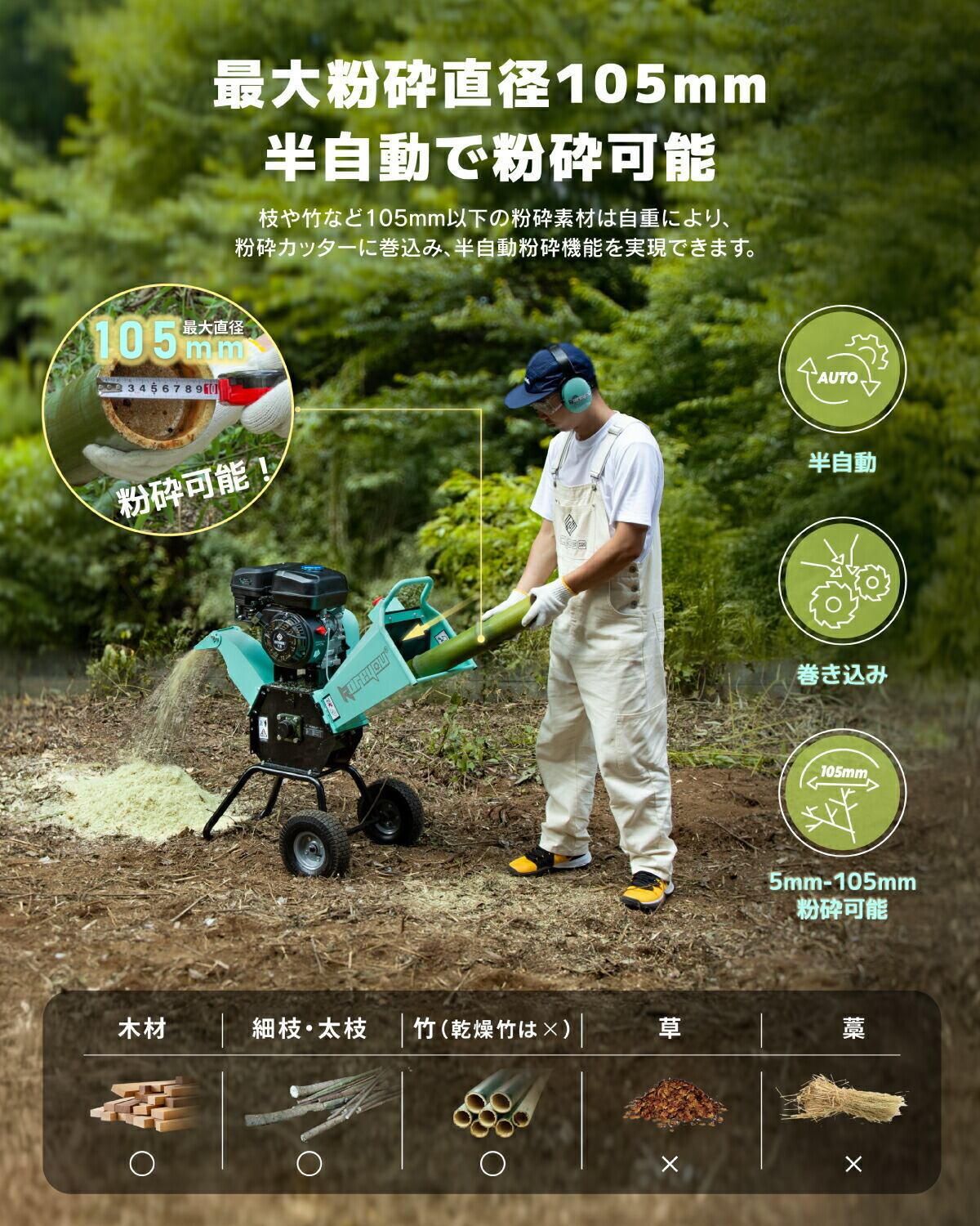 【強力エンジンで高い粉砕性能】エンジン式のこの粉砕機は、90〜105mmの太さの材木を簡単に処理することが可能です。家庭菜園や果樹園など、木の処理をスムーズに進めることができ、効率的なゴミ処理を実現します。