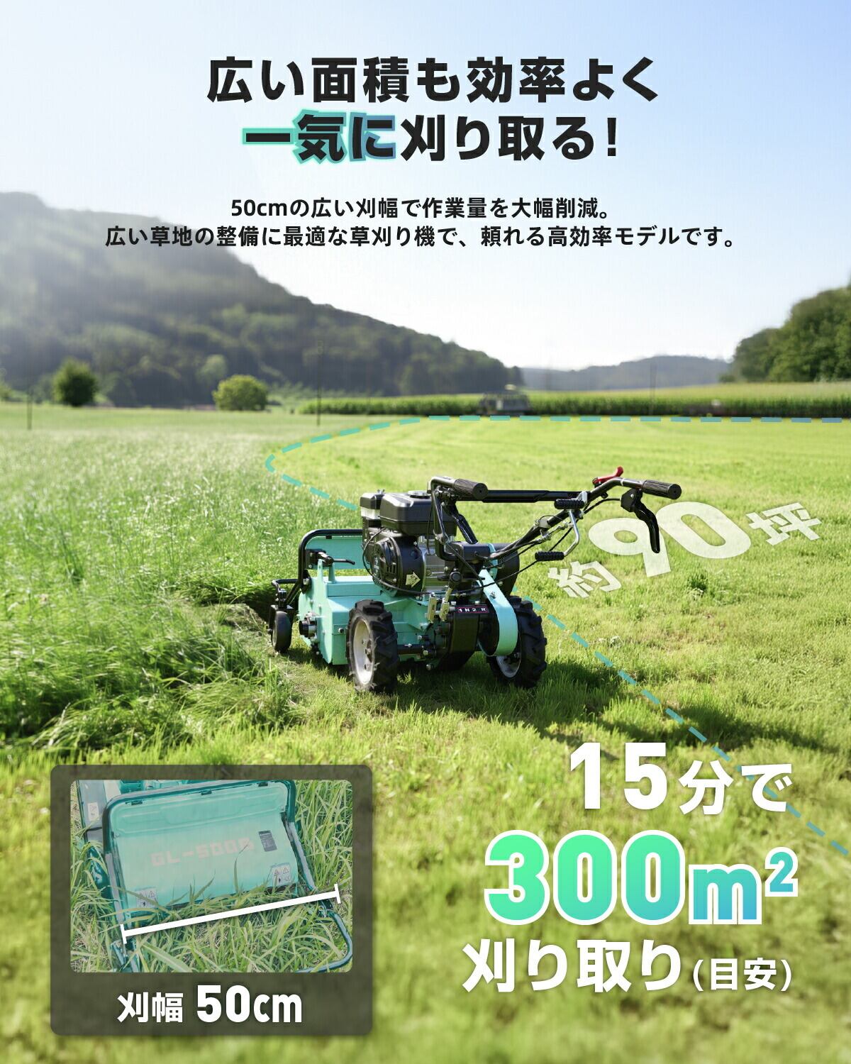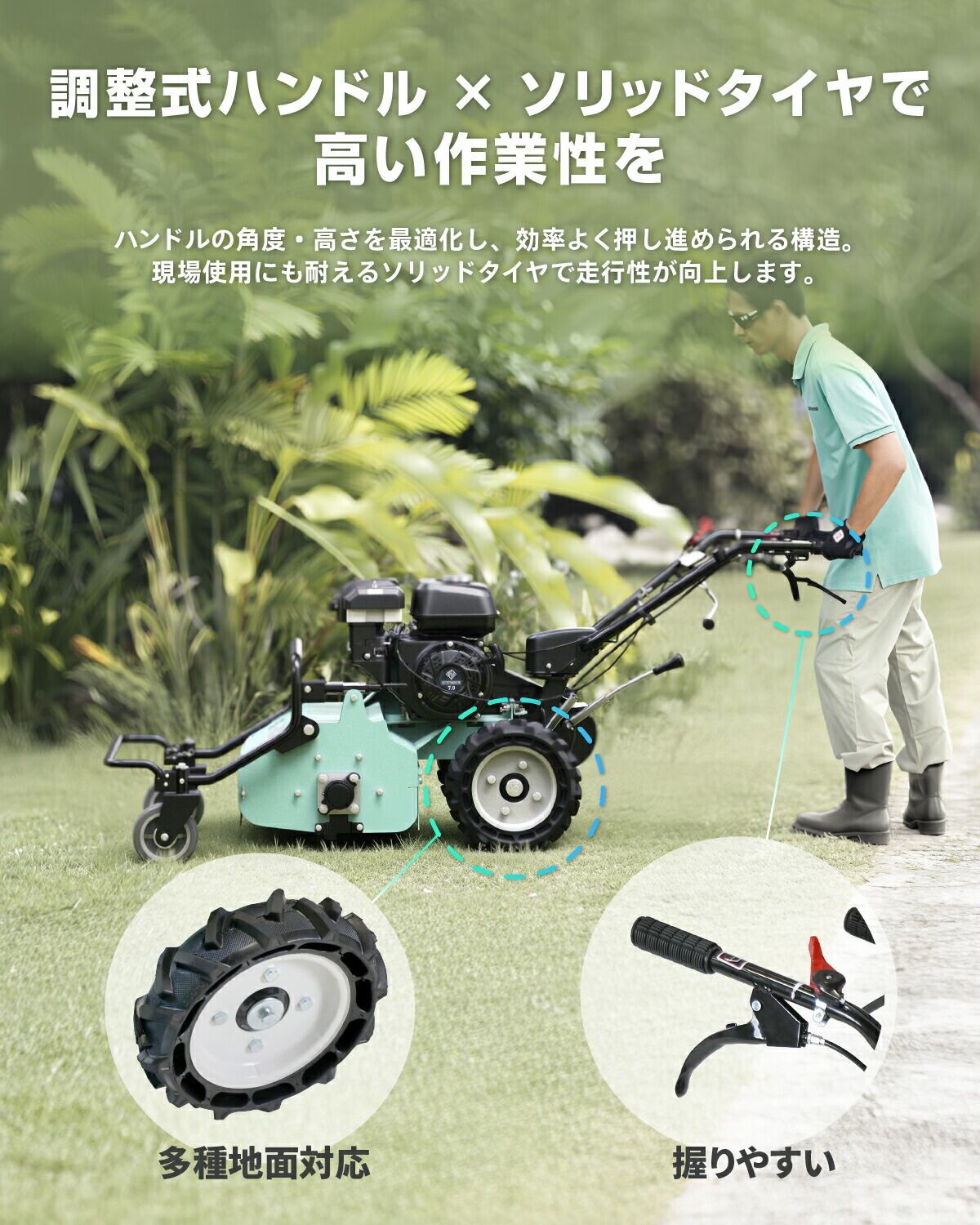 【刈高調整機能|使いやすさを追求】刈高は10mmから80mmまで調整可能で、用途に応じた仕上がりが実現します。軽量モデル(91kg)ながら、安定した作業を可能にし、長時間の作業でも快適に使用することができます。