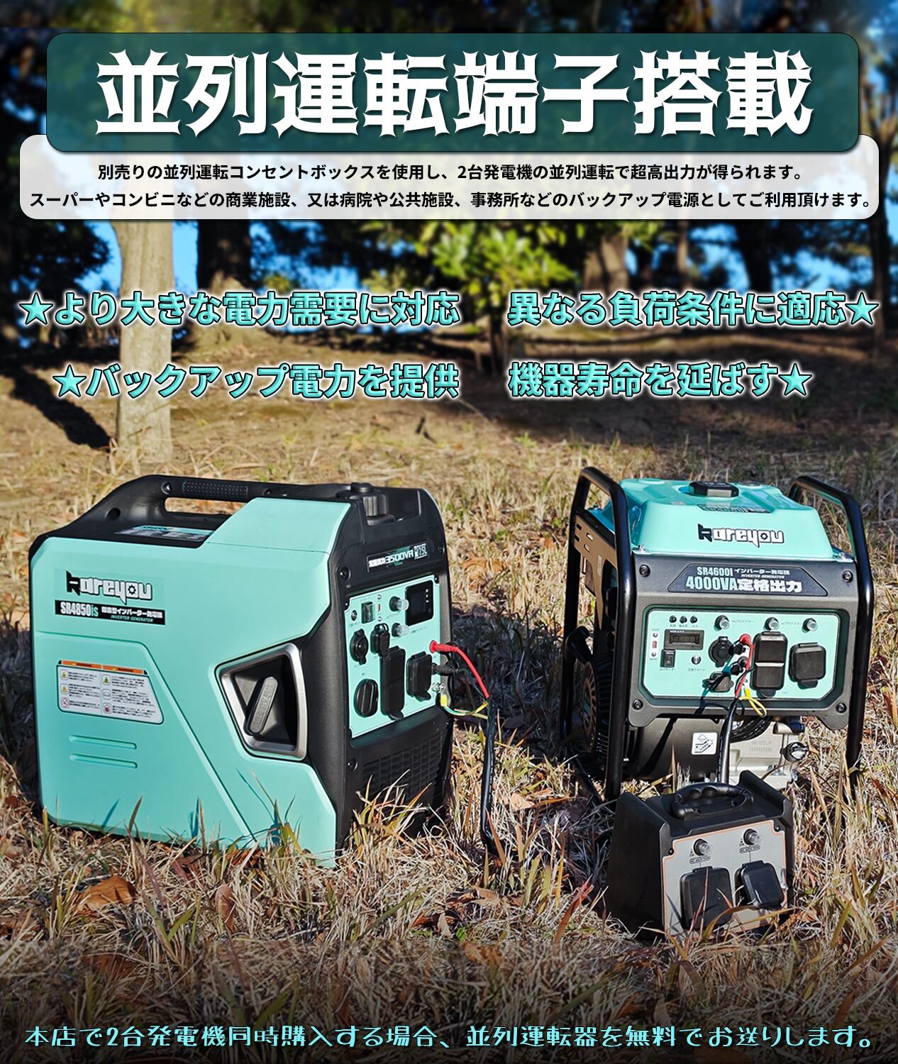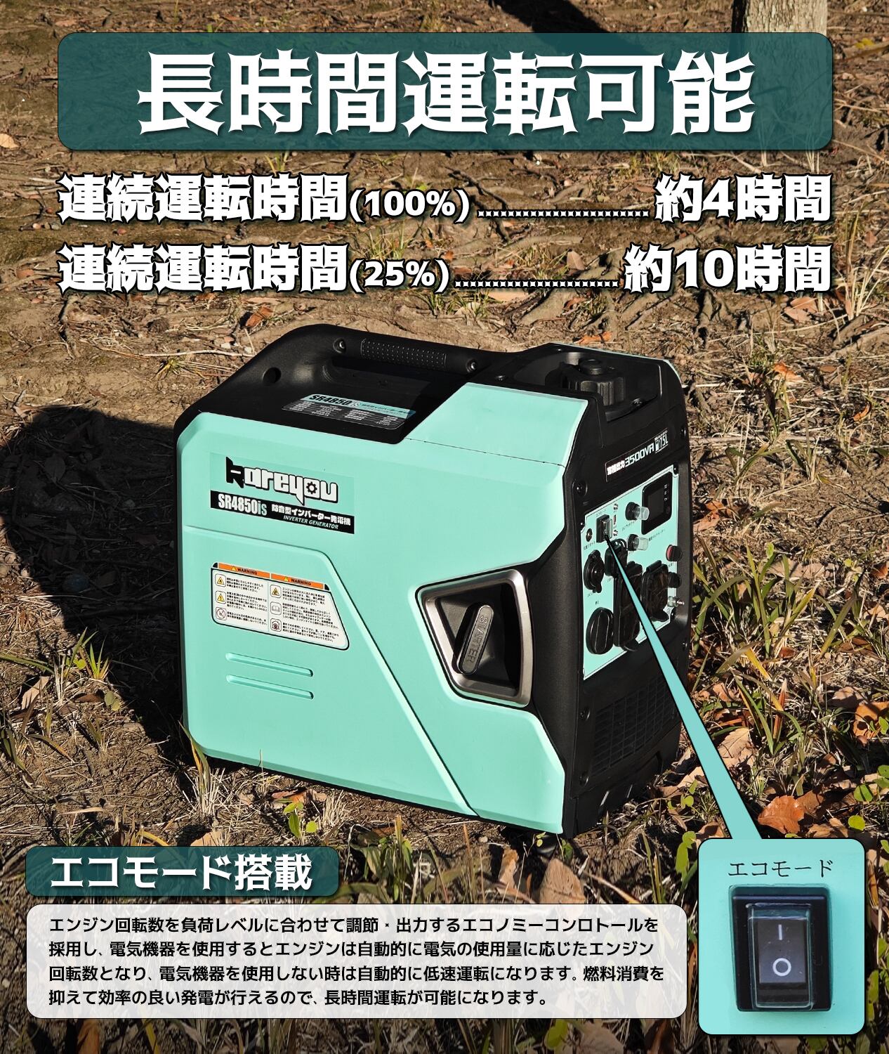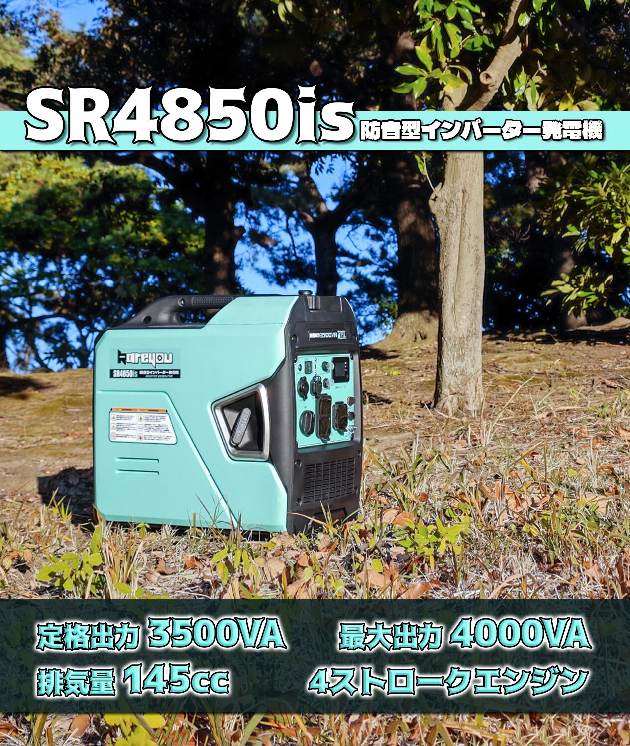 【インバーター発電機静音型SR4850is】最大出力4.0KW強力な4ストロークエンジン搭載、145cc排気量、3.5kVA定格出力、大出力なのに26kgという軽量。コンパクトサイズなので車で持ち運ぶ際にスペースが取らなく、組立不要な車輪と伸縮ハンドル付きで移動がらくらく。DC出力12V8.3A(シガーライター) *1、USB出力5V1A/2.1A、AC出力100V(5-20R)*2、L5-30*1コンセント搭載で家庭用も業務用も役に立ちます!