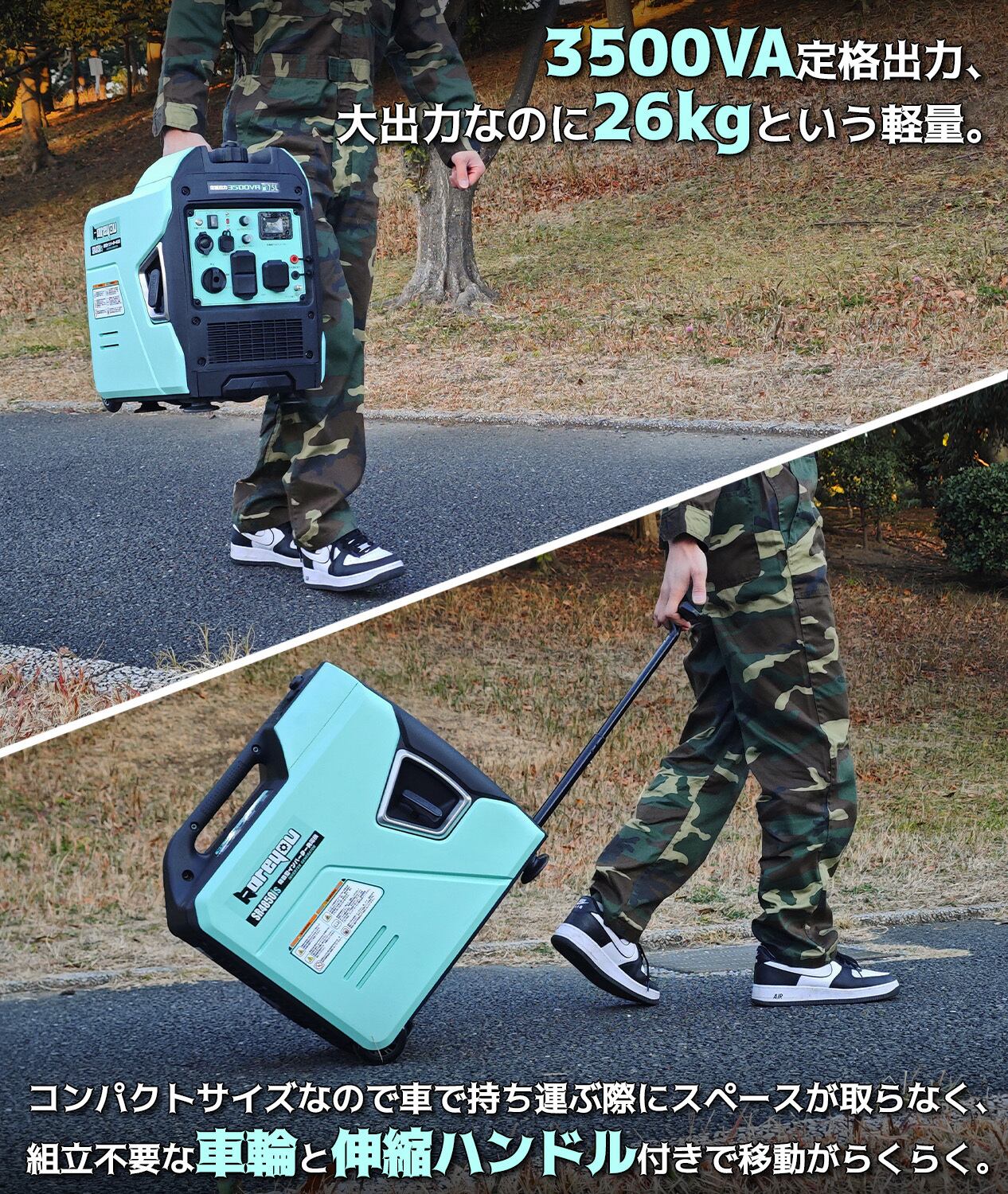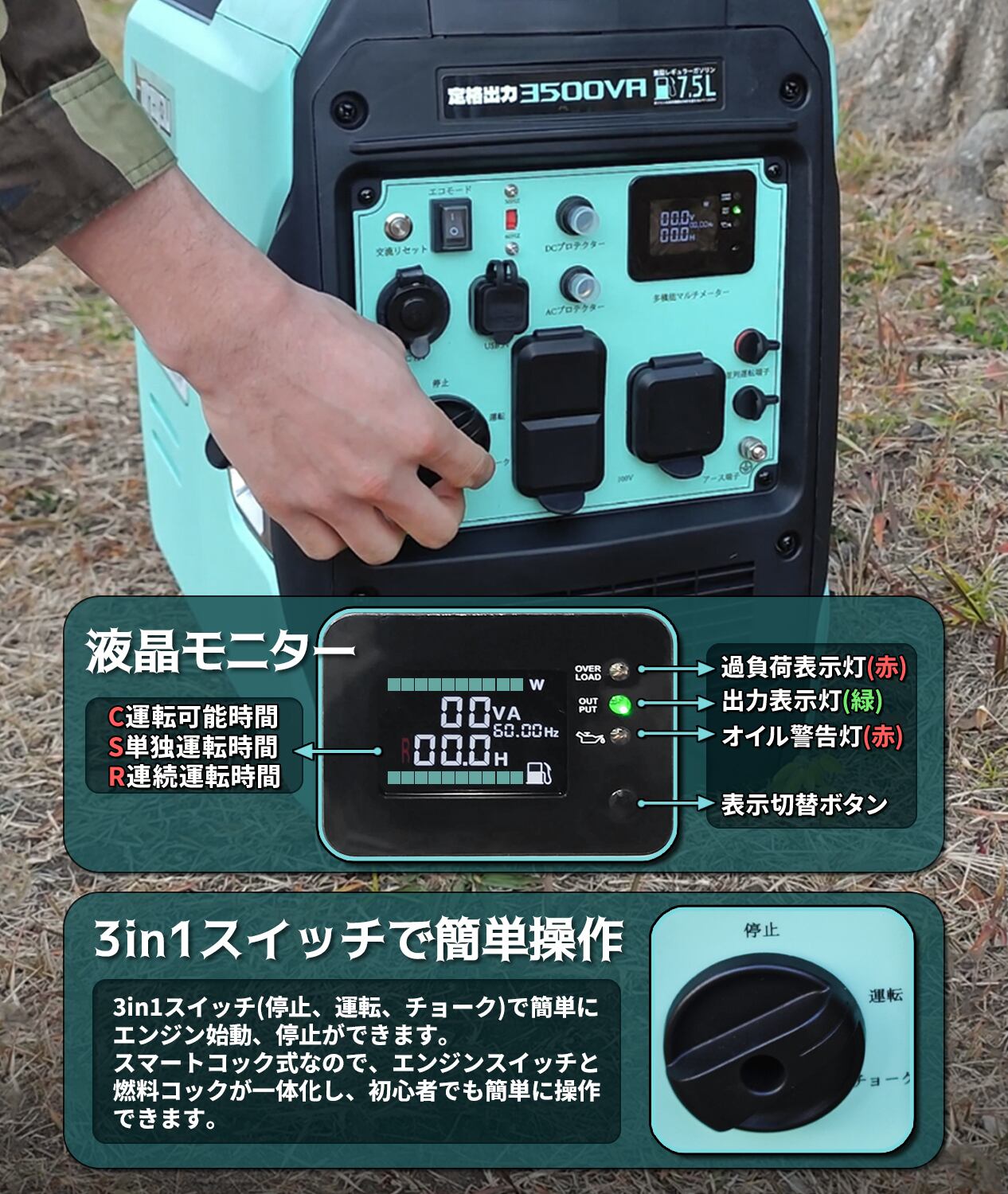 【色々な場面に適用、非常時大活躍】停電や災害時など、非常時用電源として大活躍のインバーター発電機。他のシステムから給電する電源供給装置より、安価で利便性の高いインバータ発電機による高品質な電気を供給し、家電製品の使用、通信も確保できます。防災備え以外、建築作業、DIY作業、農作業、キッチンカーにも最適。車中泊などアウトドア好きな方も十分楽しめます。一台備えると損なし!